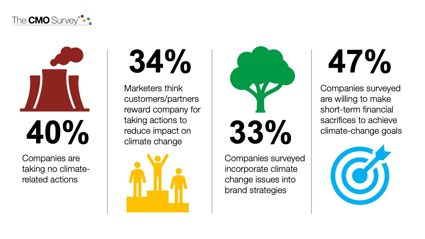 Only one-third of marketers surveyed report that their companies have specific goals related to climate change. Fewer than half of marketing leaders (47.4%) believe their companies are willing to make short-term financial sacrifices to reduce their environmental impact.